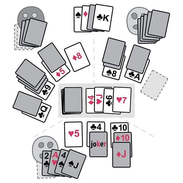 - Note that jokers can never break coherence (= must be replaceable by a real card). For example, ♧5 + joker + ♧6 is invalid, while ♧5 + ♧6 + joker + ♦7 is fine.