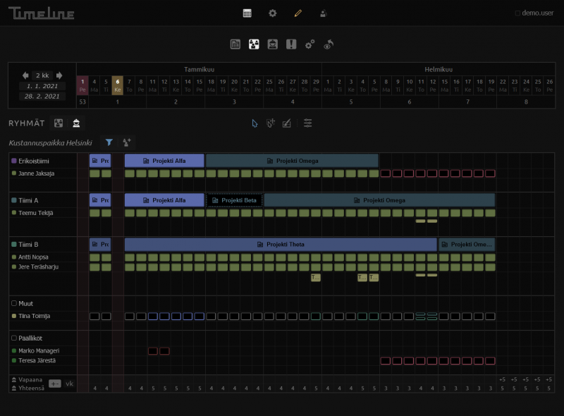 - In the calendar, each day is a column and rows represent the above units depending on the view (Resources, Groups, Projects, Vacancies).